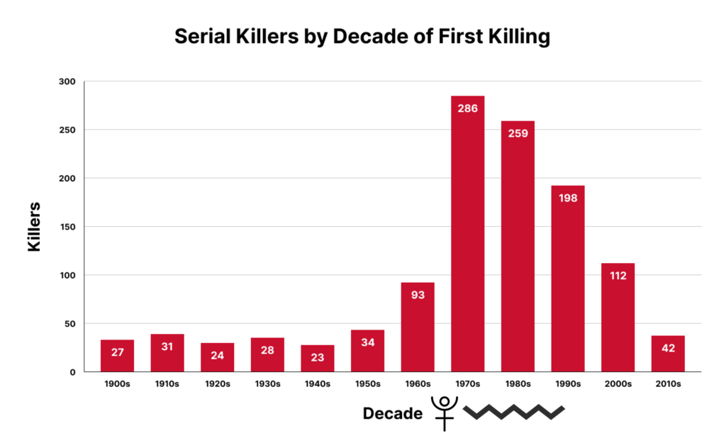 A comparison of serial killing rates and Pluto’s transit through the Via Combusta suggests an unusual correlation.The X Axis displays the number of serial killers, and the Y Axis shows the decades when their first killing happened. Along the Y Axis is Pluto’s transit through the Via Combusta.